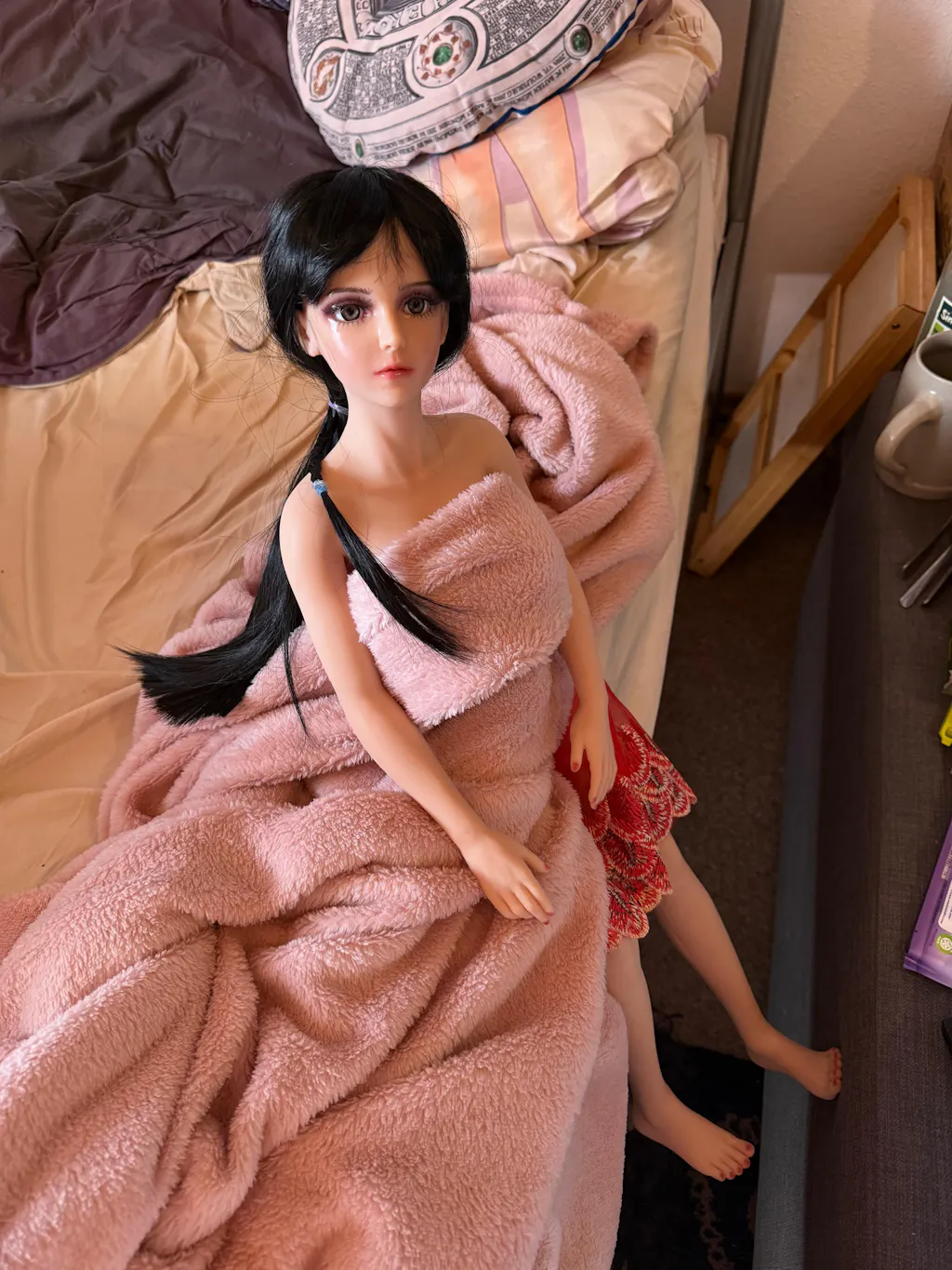 Chloe is amazing. The artwork on her face and elsewhere is done beautifully, and she is very detailed despite being so small. Her body shape is fantastic. She has nicely large breasts with her well-formed nipples pointing slightly skyward, which is very sexy. She is easily poseable, with a turnable head and easily moveable eyes. She looks great from behind, too, with her thin waist giving her an excellent hourglass figure. She’s basically a 40% scale model of a beautiful woman. I also ordered the blue eyes and flaxen hair, which can give her a very different look when you want it, Highly recommended!